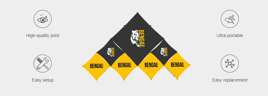 The installation is super easy and fast, just simply pop up the aluminum frame and attach the graphics for a no-fuss set-up. And each kit also includes a carrying bag for easy storage and transport.